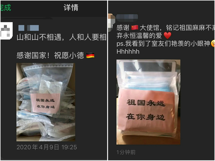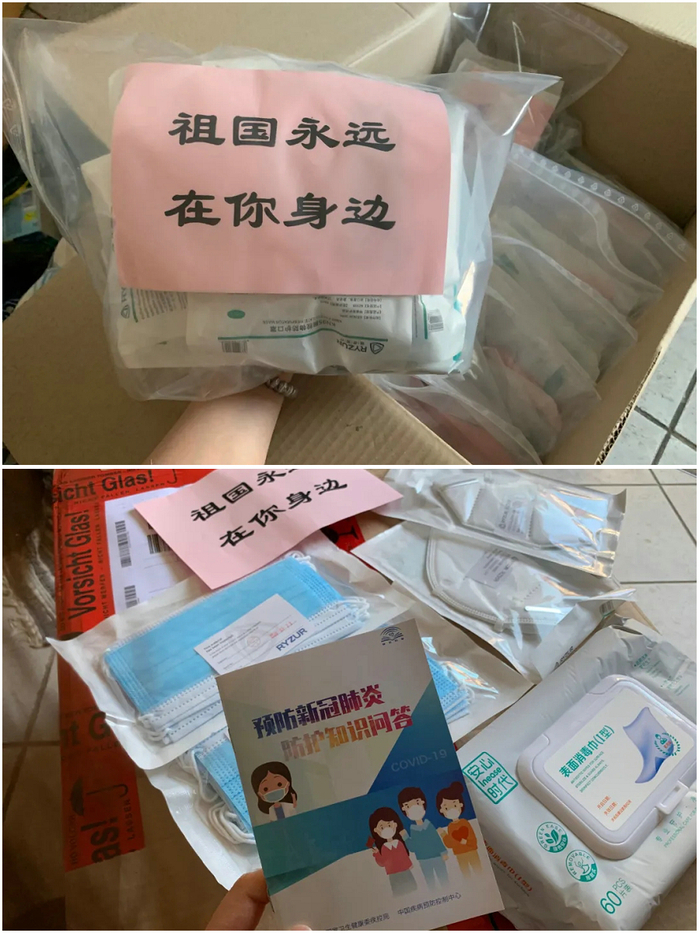 In jedem Anti-Coronas-Paket sind zwei Mundschutzmasken N95, zwanzig chirurgische Schutzmasken, Desinfektionstücher und eine Broschüre zur Aufklärung hinsichtlich des Grundwissen über Corona enthalten. Der Wert des Pakets lässt sich gerade in diesem Moment, wo Deutschland stark unter dem Mangel an medizinischen Gütern und Materialien gegen Corona leidet, nicht einfach schätzen. Studierende posteten online und im Freundeskreis Fotos zum Ausdruck ihrer Dankbarkeit an China, des chinesischen Konsulat und Unternehmen in Deutschland sowie Mitarbeiter der Studentenvereinigungen für ihre Arbeit. Sie wünschen sich Wohlstand und Prosperität für China und baldige Genesung von dieser Krise.