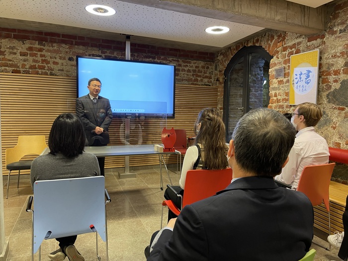 当日的颁奖典礼设在施特拉尔松德市立图书馆“百年书香”中国书画展的展会会场。作为全球孔子学院日活动之一,该书画展由施特拉尔松德孔子学院策划组织,展出北京大学陈洪捷教授的书法作品、同济大学李兴无教授的山水画作品共40余幅。颁奖典礼过后,黄伟公参为该书画展致揭幕辞。黄伟表示,两项活动相辅相成、相得益彰,望获奖选手能够通过中国书画展进一步了解中国文化,激发出更加浓厚的学习兴趣。