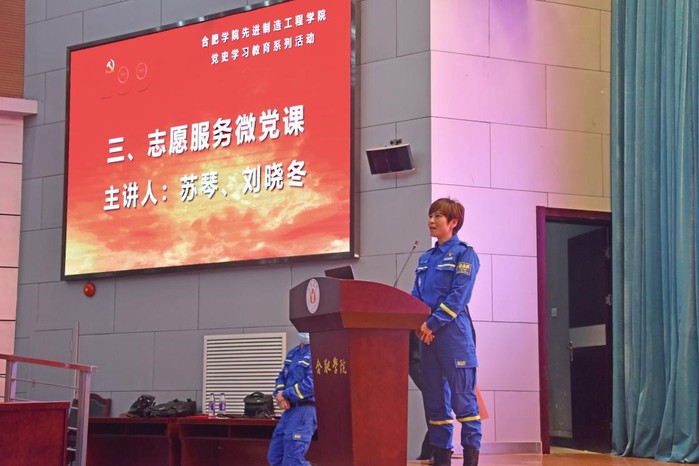 本次讲座邀请苏琴担任主讲,苏琴曾获“全国三八红旗手” “全国消防先进个人”“安徽省防汛救灾先进个人”等多项国家和省市荣誉称号。“宁防九次空,不放一次松。”“民有所需,我有所为。”“我是队长,危险时刻我必须第一个冲在最前面!”苏琴用亲身经历和一个个感人的故事为在场的所有同学上了一堂生动的志愿服务微党课。她用真实的事例讲述了队员们一起在驰援武汉抗“疫”和近几年来辗转肥西、庐江、池州、郑州等多地执行抗洪抢险任务中发生的一个个真实而让人动容的故事,让现场的师生们一次次泪目,真正体会到蓝天救援队“最美逆行者”的感人力量。他们用坚韧不拔的意志、一往无前的勇气、直面挑战的果敢完美诠释了新时代的雷锋精神。