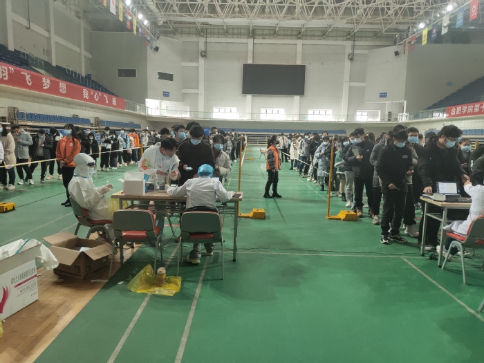 12月23日上午,学校在校体育馆主馆启动核酸检测服务。医护人员、学生志愿者分工协作,组织参加核酸检测的学生有序间隔排队、顺利采集样本,全程快速高效,为1668位考研学子提供了高质量的服务。