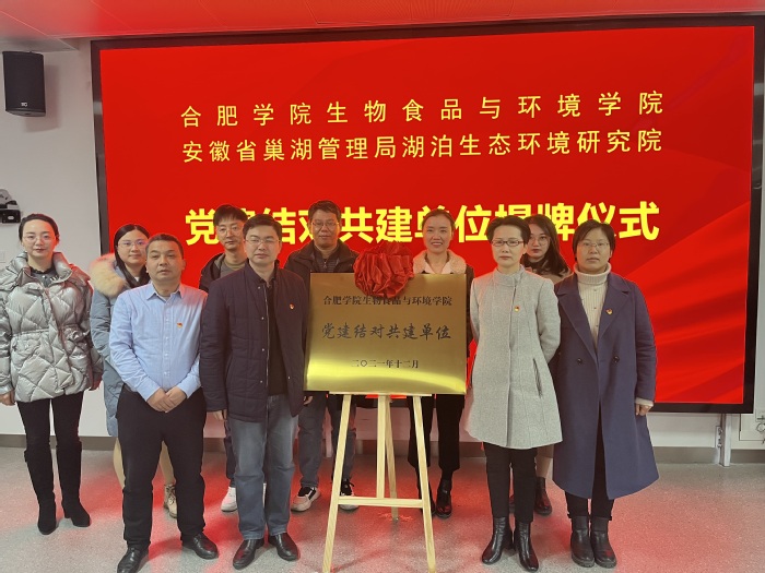 为切实推动党建工作创新,不断提高党建引领事业发展能力,增强师生党员服务社会能力,1月7日,生物食品与环境学院、巢湖管理局湖泊生态环境研究院(巢湖研究院)举行党建结对共建单位揭牌仪式。巢湖研究院党支部书记、副院长唐晓先,巢湖研究院总工程师万能胜,环境科学研究室副主任高芮,科研管理部副部长韩琦,生物食品与环境学院全体党委委员、环境工程系教师及学生党支部书记参加仪式。仪式由唐晓先主持。