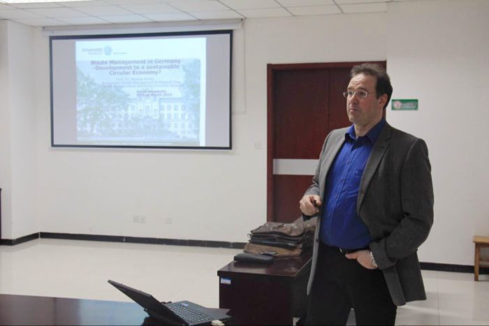 作为我校环境工程研究生专业德方教授,莱勒斯为研究生专业学生完成了废弃物管理领域的相关讲座,详细介绍了德国废弃物管理与处理领域相关政策、机制、技术及工程方面知识,并依据其自2002年以来与我院在华长期项目经验,就中国废弃物处理领域的相关问题提出了合理建议。讲座后,莱勒斯还与学生们就彼此关心的环境话题,以及我校环境工程专业研究生赴德游学和继续攻读博士学位等事宜进行了介绍和交流。