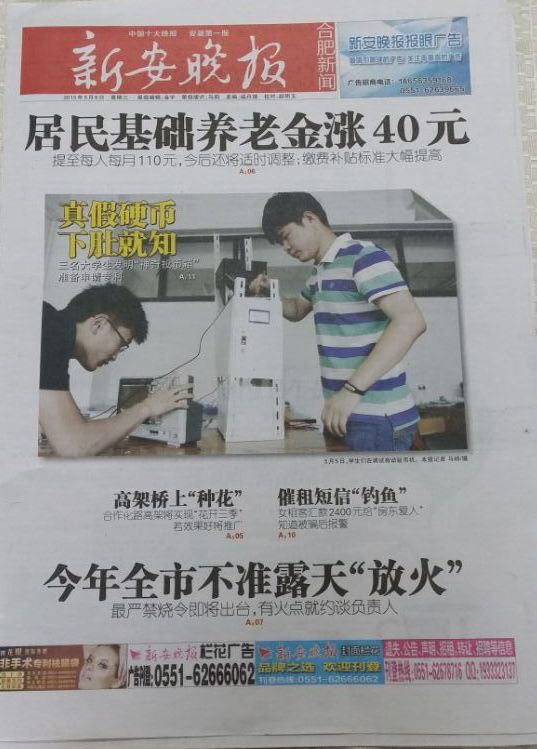 “现在公交车投币箱大多只能收集硬币,没有鉴别、清点的功能,一些假币、游戏币混杂其中。”汪程告诉记者,针对这些问题,他和石响、禹芮两名同学花费了近4个月时间,研发了这套系统。系统融合了计算机、通讯、电子等技术,破解了这一难题。