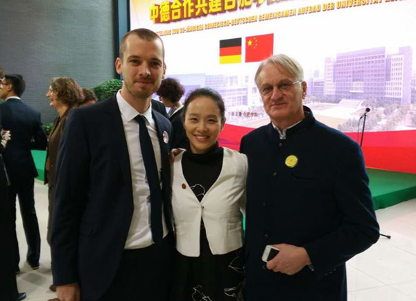 此次外事翻译人员中,外国语言系11名德语教师全程深度参与了德国代表团翻译和接待工作,在没有耽误系部教学工作的前提下,放弃休息时间,全力投入到德国高访团的翻译和接待工作中,在短短几日时间内加班加点完成了难度较高的笔译任务,翻译字数合计28132;此外,还承担了大量的口译任务,全程全天陪同7位中德领导共计7天,省市领导会见翻译3人次,以及省市领导宴请翻译多人次。“其实笔译已有的文本合同虽然繁重,却有迹可循。口译工作难度高,灵活性大,最考验翻译人员能力。我系李菲菲,张雪,刘铭渝老师协助配合省外办的接待和翻译工作,全程陪同了德方代表团,承担省市领导的陪同翻译。除此之外,江红老师在参加完两位总理访问我院的活动后,又赶赴另一会场,为陈树隆副省长和德国经济代表团的见面会承担口译任务。“我和另外四位负责包括中午和晚上的省市领导的宴请口译工作。由于省商务厅许多安排我们事先无法得知,负责口译的老师几乎都是临阵上战场的,只能用翻译前的一段时间紧急了解会议情况。”外语系教师高清回忆起当天的情形仍有些压力山大。