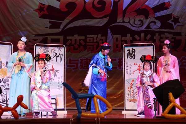 晚会在激情四射、动感十足的双人舞蹈《Dangerous》中拉开帷幕,六盏聚光灯汇聚舞台中央,悠扬浓厚的萨克斯配合不老经典《我心永恒》瞬间唤醒了观众的双耳。随后,孔津京凭借其超高的音准,以一首《死了都要爱》带动全场氛围,声嘶力竭的喊叫响彻礼堂,现场观众不觉为之震惊。紧接着,中文系老师王玉琴独唱《绒花》,粉色长袍下的歌喉更加温婉动人。朗诵表演《朱子家训》,在回顾千年前朱子谆谆教诲的同时,也让观众深深地沉浸在博大精深的国学思想中。古琴曲《梅花三弄》,传神的演绎尽显中文学子的风采。小品表演《倩女幽魂》,利用反串形象成功地突破了经典的塑造,传统故事的现代演绎令观众眼前一亮,一度将现场气氛推向高潮,引得全场爆笑,掌声雷动。此外,激情洋溢的B-BOX、性感帅气的现代舞《IT’ ME》也让现场观众尖叫连连,掌声不断。最终,晚会在一曲古典舞《玉生烟》的优美舞姿中圆满落下帷幕。中文系党总支书记朱涛还以一幅对联,“校风系风班风学风考风教风,风气纯正,风尚高雅;勇气志气才气正气喜气和气,气象万千,气魄宏伟”对此次晚会给予了衷心的祝愿和美好的希冀。