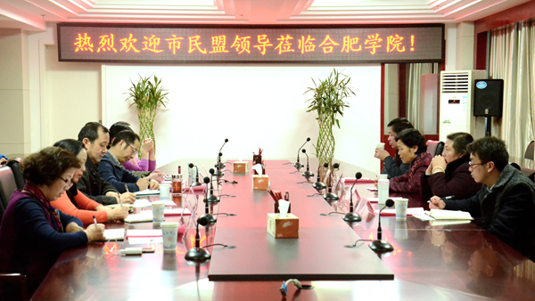 12月16日,由民盟安徽省副主委、民盟合肥市主委张雪平,民盟合肥市副主委、市政协副主席奚之英,民盟合肥市副主委胡平等组成的民盟工作调研组来访我校,校纪委书记洪家友、宣传统战部长刘樟树、宣传统战部副部长刘玉培、民盟合肥学院总支主委胡雁玲等在校行政楼九楼东会议室热情接待了调研组。双方就加强民盟组织建设,进一步促进民盟合肥学院总支工作有效开展进行了认真交流。