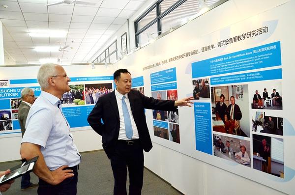 Nach der Besprechung besichtigten sie gemeinsam die Ausstellung über den 30-jährigen Aufbau der Universität Hefei unter der deutsch-chinesischen Kooperation. Daran nahmen unter anderem Herr Jia Feng, Direktor und Herr Sun Jianan, Vizedirektor des International Offices der Universität Hefei, Herr Wang Jianbin, Dekan des Instituts für Germanistik und Direktor des Deutschen Forschungszentrums an der Fremdsprachenuniversität Beijing, sowie Frau Zhang Xiaohui, Direktorin der Arbeitskomitee für Konfuzius-Instituts teil.